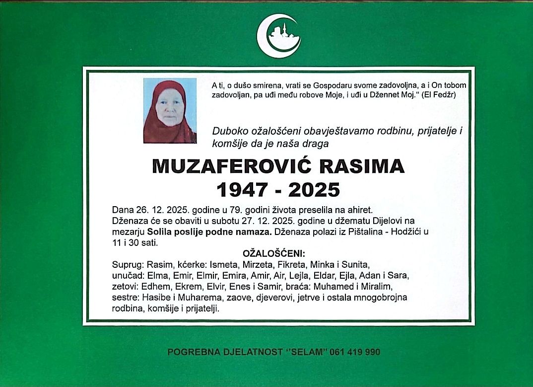Duboko ožalošćeni obavještavamo rodbinu, prijatelje i komšije da je naša draga MUZAFEROVIĆ RASIMA dana 26.12.2025. godine, u 79. godini života preselila na ahiret.