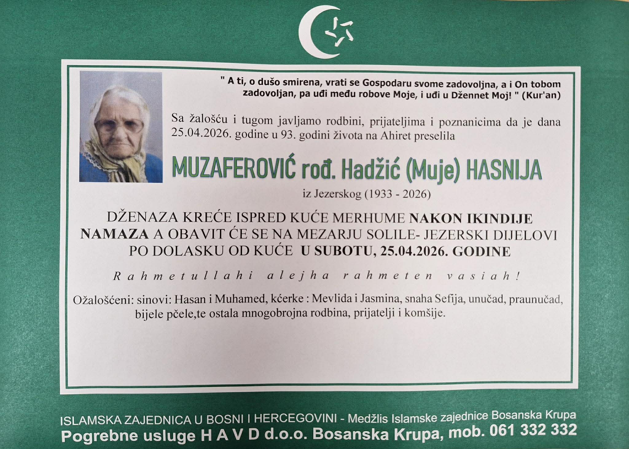 Tužnim srcem i bolom u duši javljamo rodbini, prijateljima i komšijama da je naša draga Muzaferović rođ. Hadžić (Muje) Hasnija, dana 25.04.2026. godine u 93-oj godini života, preselila na Ahiret.