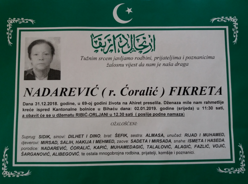 Tužnim srcem javljamo rodbini, prijateljima i poznanicima žalosnu vijest da nam je naša draga Nadarević (r. Ćoralić) Fikreta dana 31.12.2018. godine, u 69-oj godini života na Ahiret preselila.
