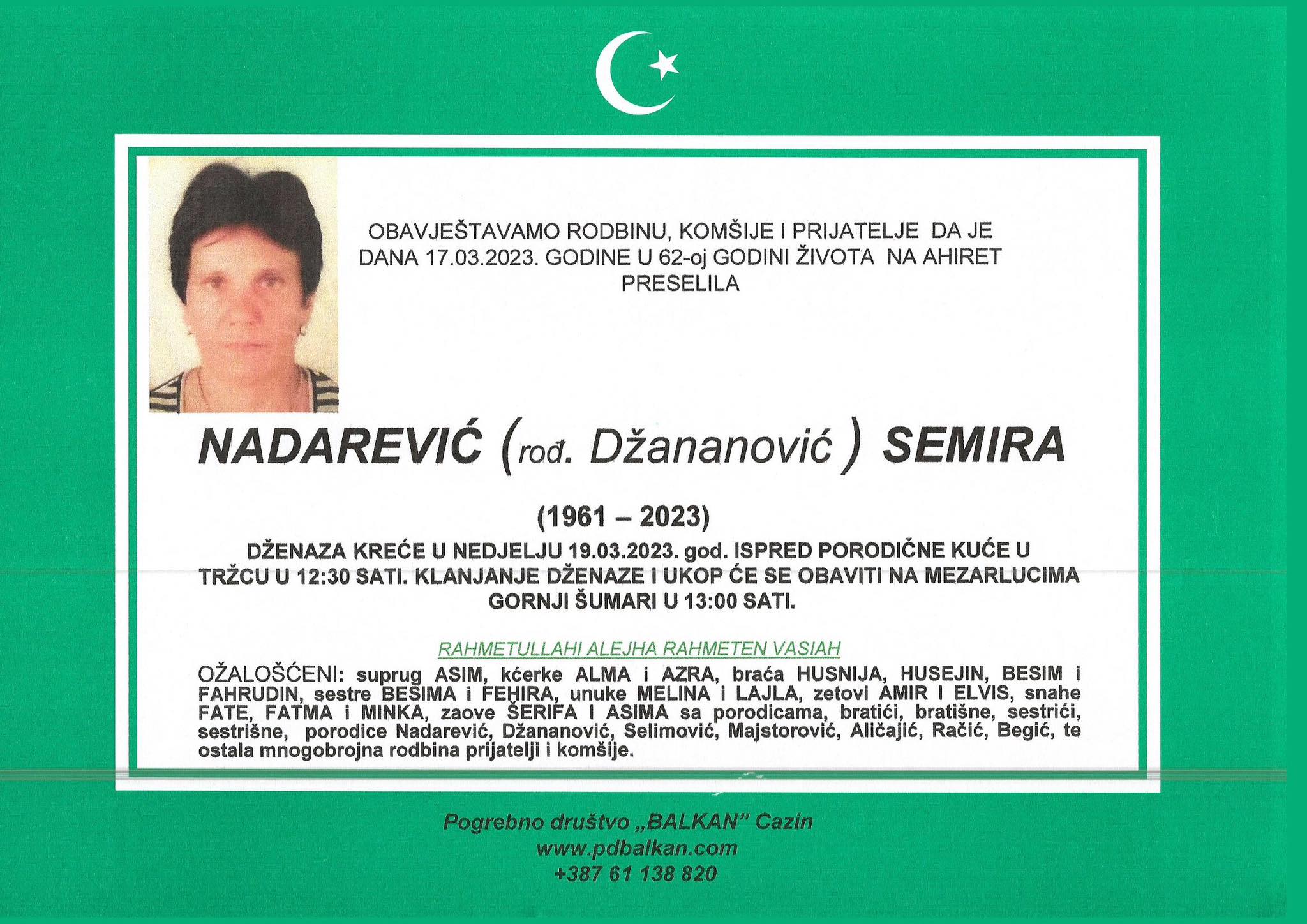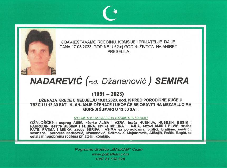 Obavještavamo rodbinu, prijatelje, poznanike i komšije da je dana 17.03.2023 god. u 62-oj godini života na Ahiret preselila naša draga Nadarević (rođ. Džananović) Semira.