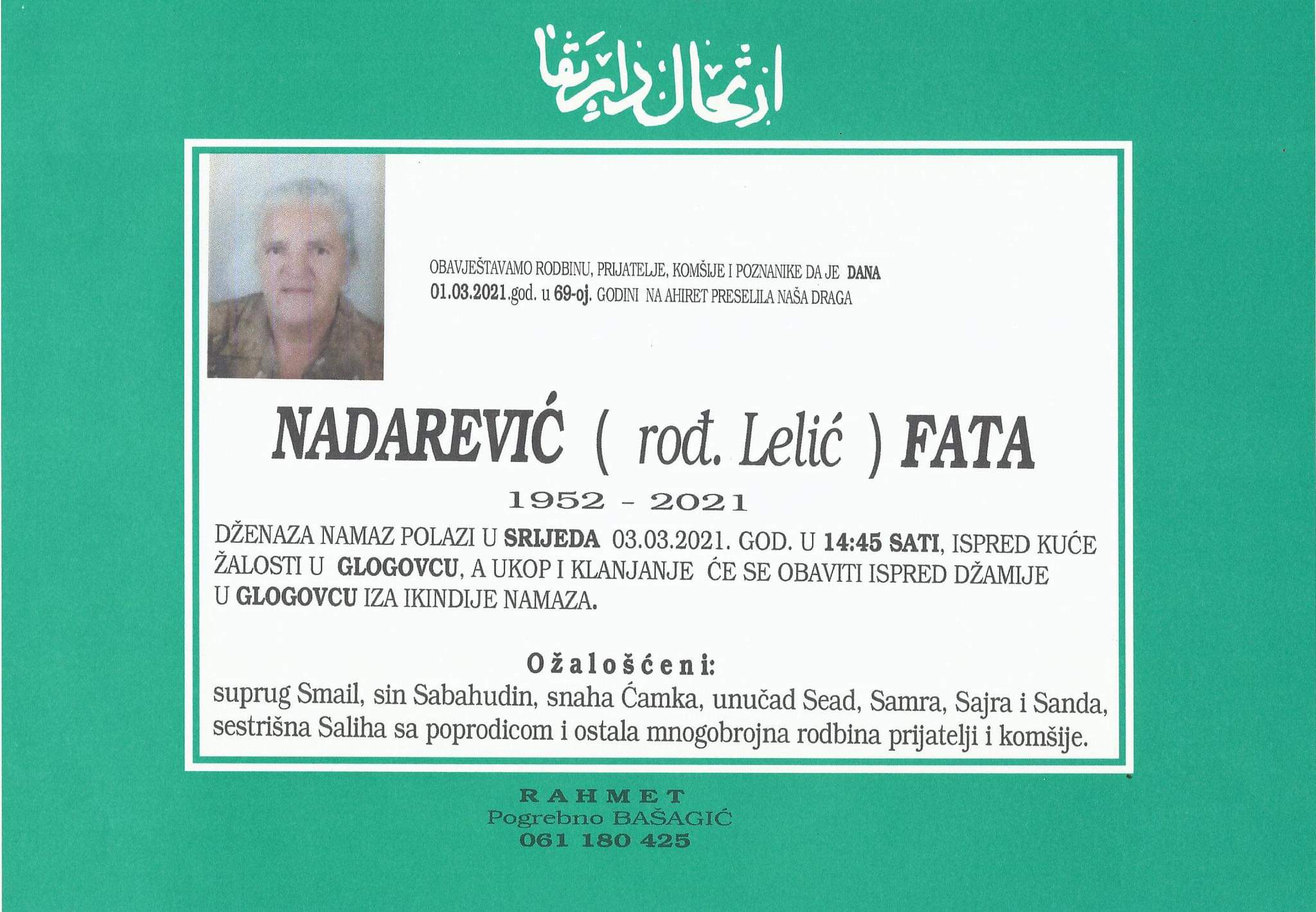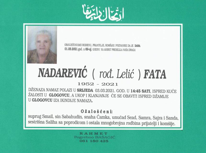 Tužnog srca i s bolom u duši obavještavamo rodbinu, komšije i prijatelje da je naša draga Nadarević (rođ. Lelić) Fata, dana 01.03.2021. godine, u 69-oj godini života, preselila na Ahiret.
