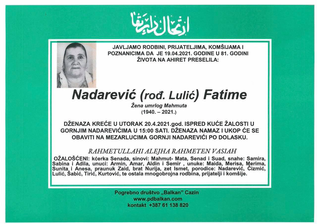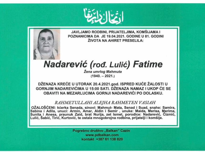 Tužnog srca i s bolom u duši obavještavamo rodbinu, komšije i prijatelje da je naša draga Nadarević (rođ. Lulić) Fatime, žena umrlog Mahmuta, dana 19.04.2021 godine, u 81-oj godini života, preselila na Ahiret.