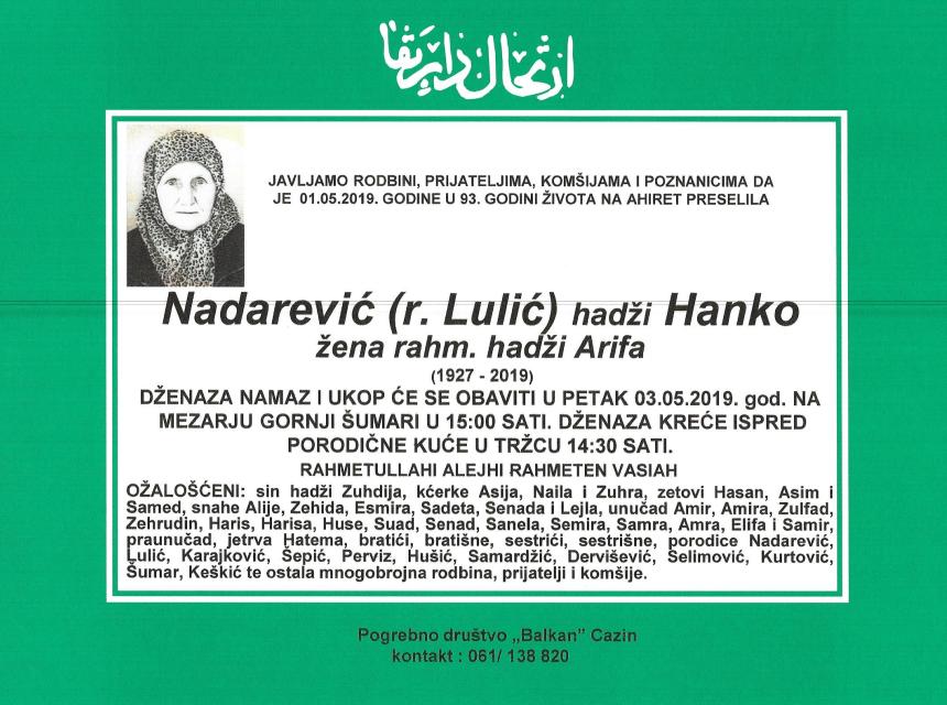 Javljamo rodbini, prijateljima, komšijama i poznanicima da je u Austriji dana 1.5.2019.godine u 93.- oj godini života na Ahiret preselila Nadarević (rođ. Lulić) hadži Hanko.