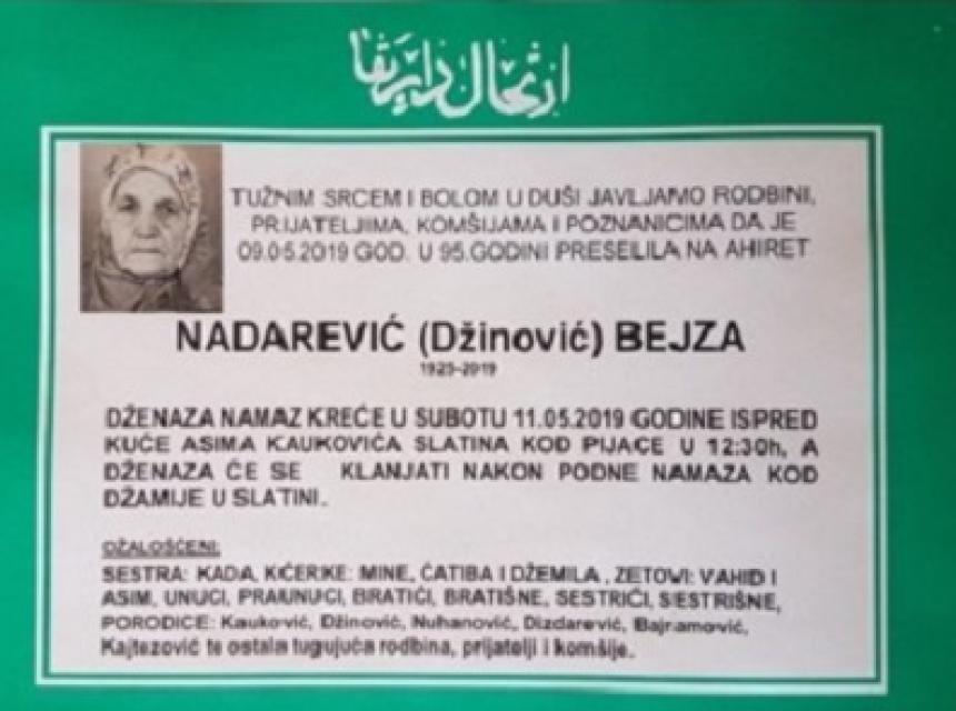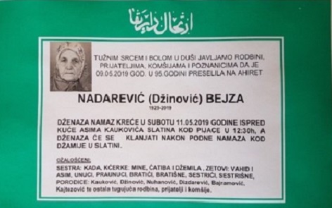 Tužnim srcem i bolom u duši javljamo rodbini, prijateljima, komšijama i poznanicima da je dana 09.05.2019. godine u 95. godini života na Ahiret preselila Nadarević (rođ.Džinović) Bejza.
