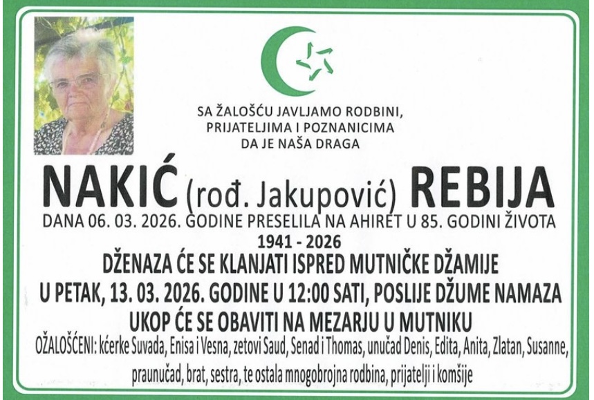 Dženaza će se klanjati ispred Mutničke džamije u petak, 13. 03. 2026. godine u 12:00 sati, poslije džume-namaza.