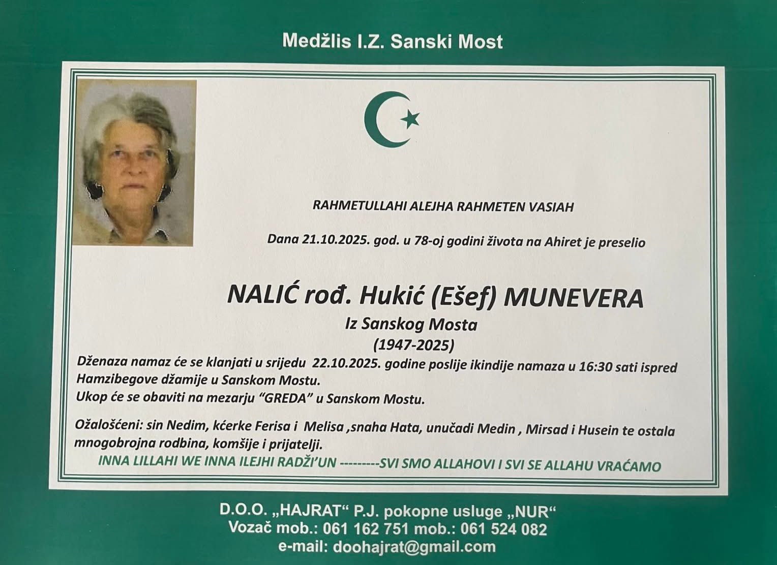 Dženaza-namaz će se klanjati u srijedu, 22.10.2025. godine, poslije ikindije-namaza u 16:30 sati ispred Hamzibegove džamije u Sanskom Mostu.