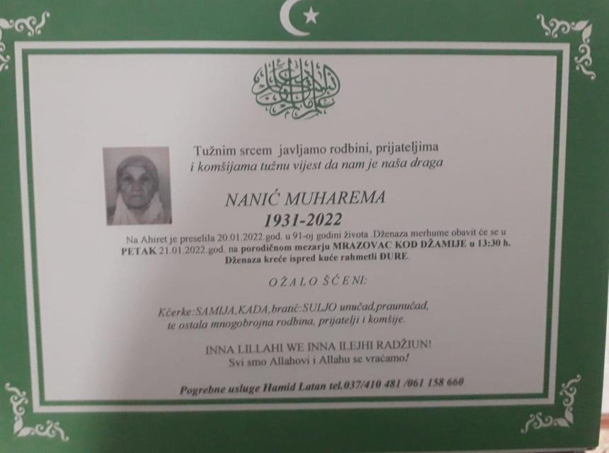 Tužnog srca i s bolom u duši obavještavamo rodbinu, komšije i prijatelje da je naša draga Nanić Muharema, dana 10.01.2022. godine, u 91-oj godini života, preselila na Ahiret.