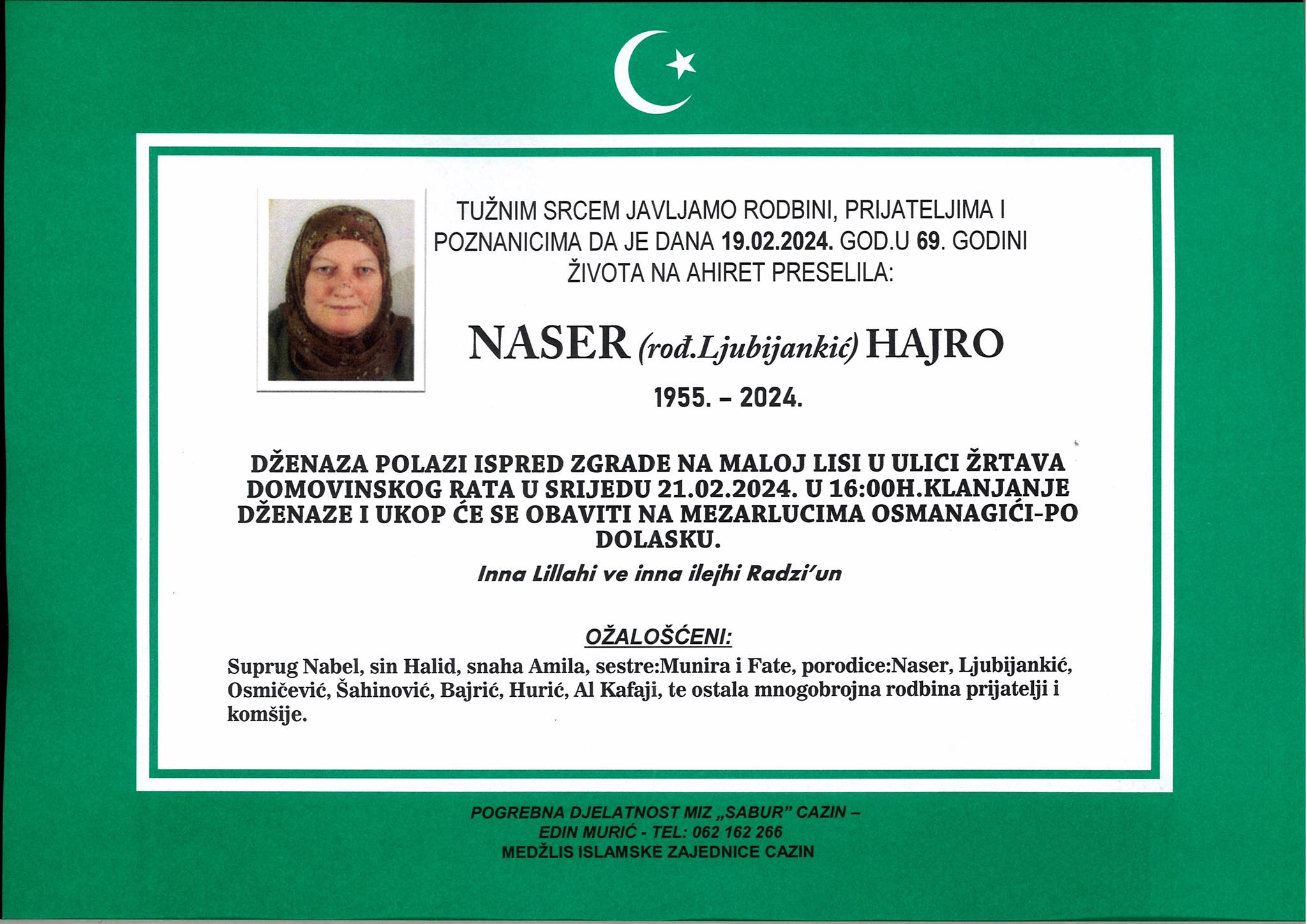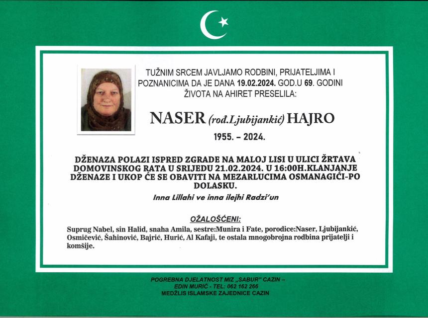 Tužnim srcem javljamo rodbini, prijateljima, komšijama i poznanicima žalosnu vijest da nam je naša draga Naser (rođ.Ljubijankić) Hajro dana 19.02.2024. godine u 69. godini života preselila na Ahiret.