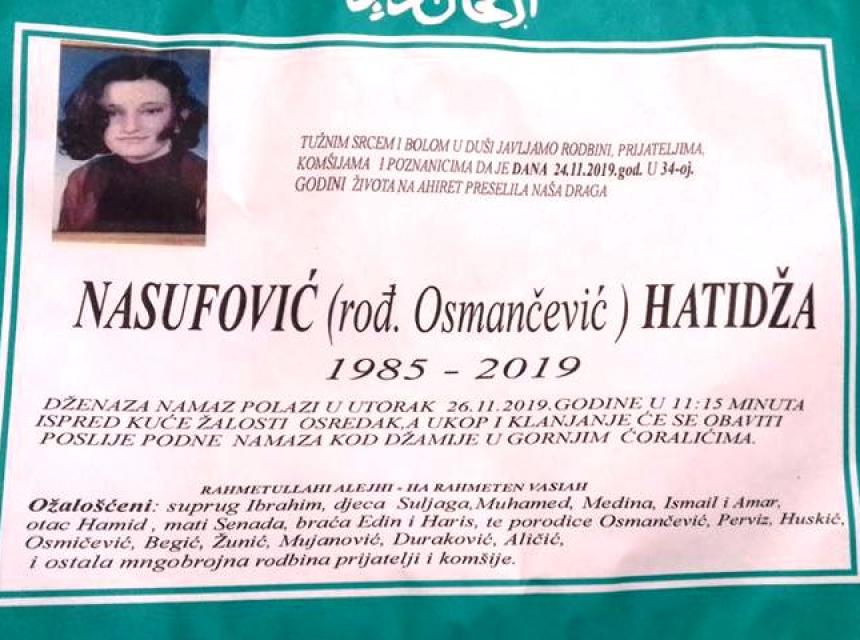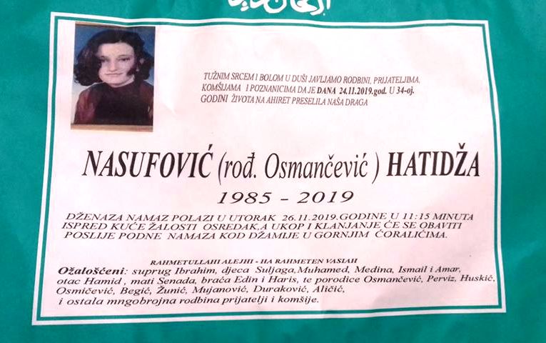 Sa žalošću javljamo rodbini, prijateljima i poznanicima da je dana 24.11.2019. godine na Ahiret u 34-oj godini života preselila Nasufović (rođ. Osmančević) Hatidža.
