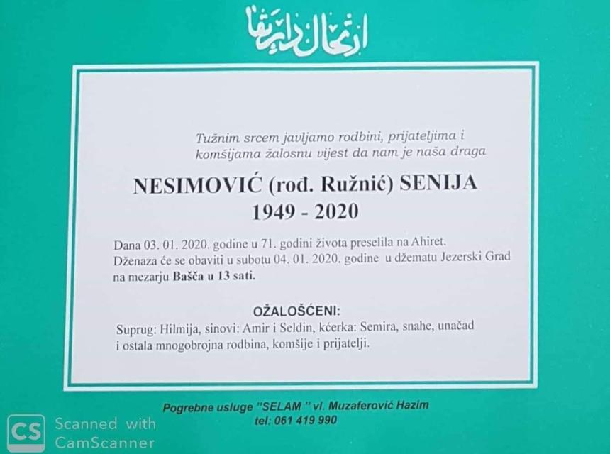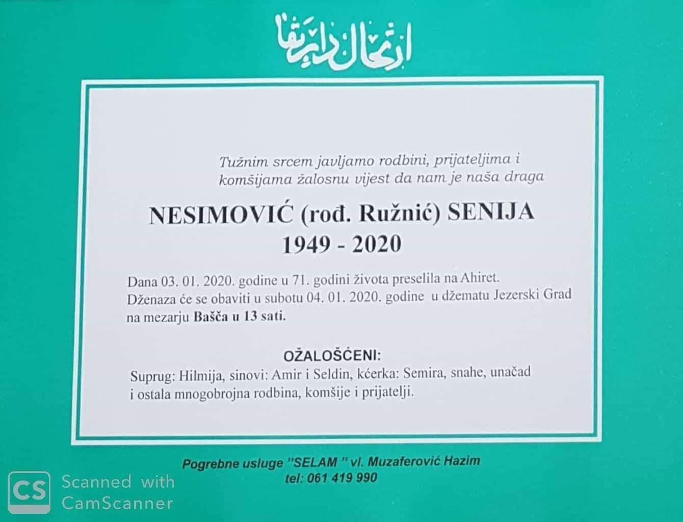 Tužnim srcem javljamo rodbini, prijateljima i komšijama da je dana 03.01.2020. godine u 71. godini života na Ahiret preselila naša draga Nesimović (rođ. Ružnić) Senija.