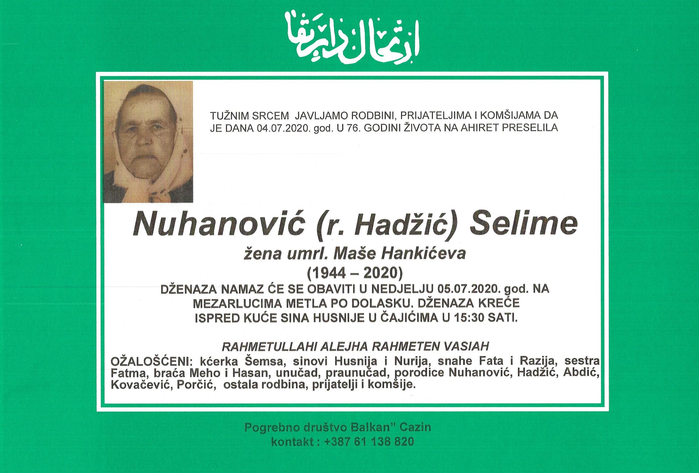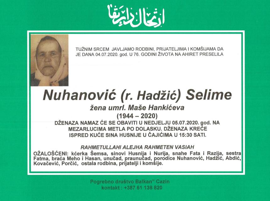 Tužnim srcem i bolom u duši javljamo rodbini i prijateljima da je dana 04.07.2020. godine u 76-oj godini života, na Ahiret preselila Nuhanović (Hadžić) Selime.