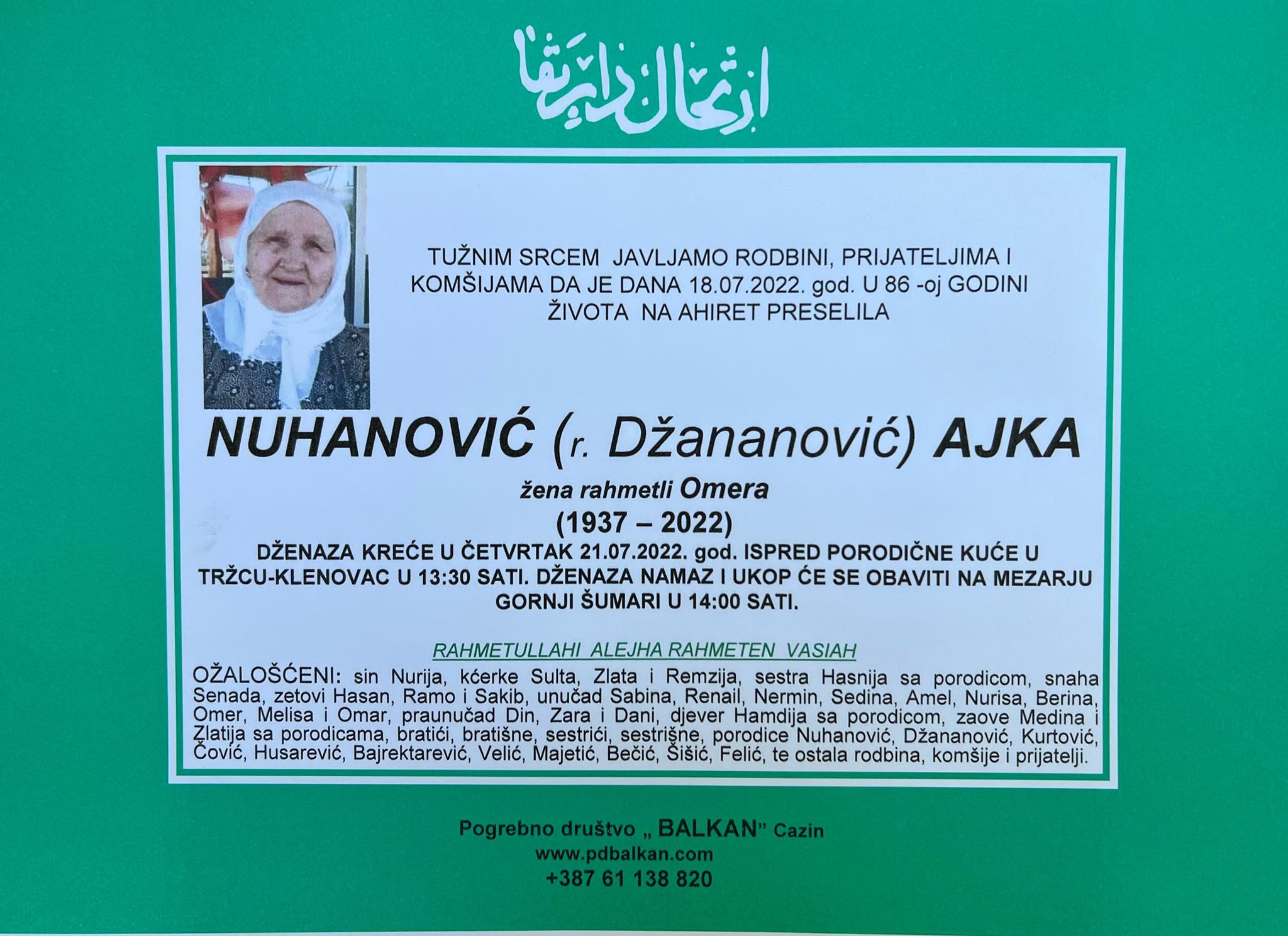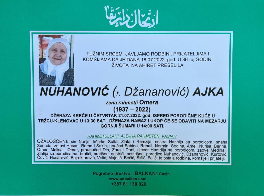 Tužnim srcem i bolom u duši javljamo rodbini, prijateljima i komšijama da je dana 18.07.2022. godine, u 86-oj. godini života na Ahiret preselila Nuhanović (rođ. Džananović) Ajka.