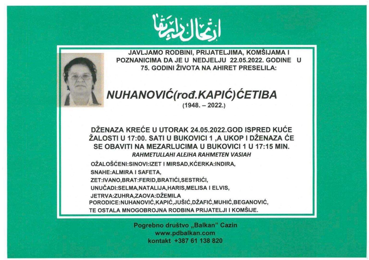Tužnog srca i s bolom u duši obavještavamo rodbinu, komšije i prijatelje da je naša draga Nuhanović (rođ. Kapić) Ćetiba u 75. godini života preselila na Ahiret.