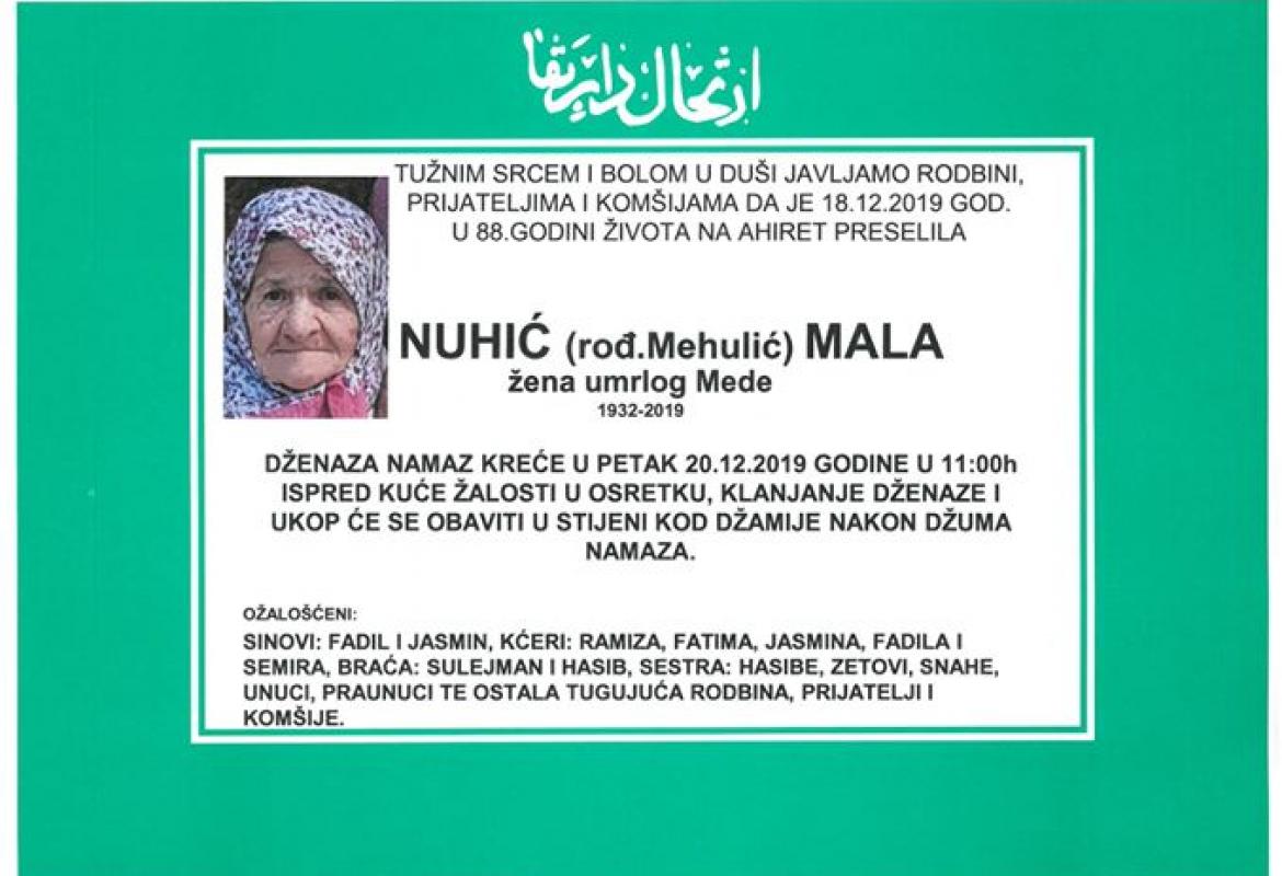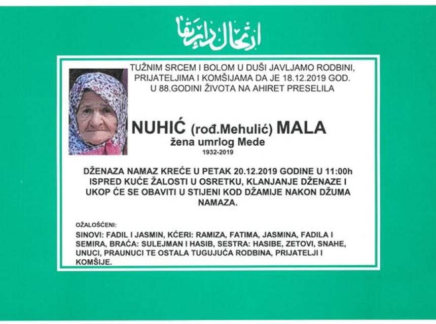 Tužnim srcem i bolom u duši javljamo rodbini, prijateljima, komšijama i poznanicima da je 18.12.2019. godine u 88-toj godini života na Ahiret preselila Nuhić rođ. Mehulić Mala, žena umrlog Mede.