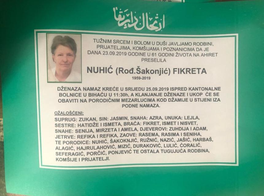 Dženaza namaz kreće u srijedu, 25.09.2019. godine, ispred Kantonalne bolnice u Bihaću u 11:30 sati, a klanjanje dženaze i ukop će se obaviti na porodičnim mezarlucima kod džamije u Stijeni iza podne namaza.