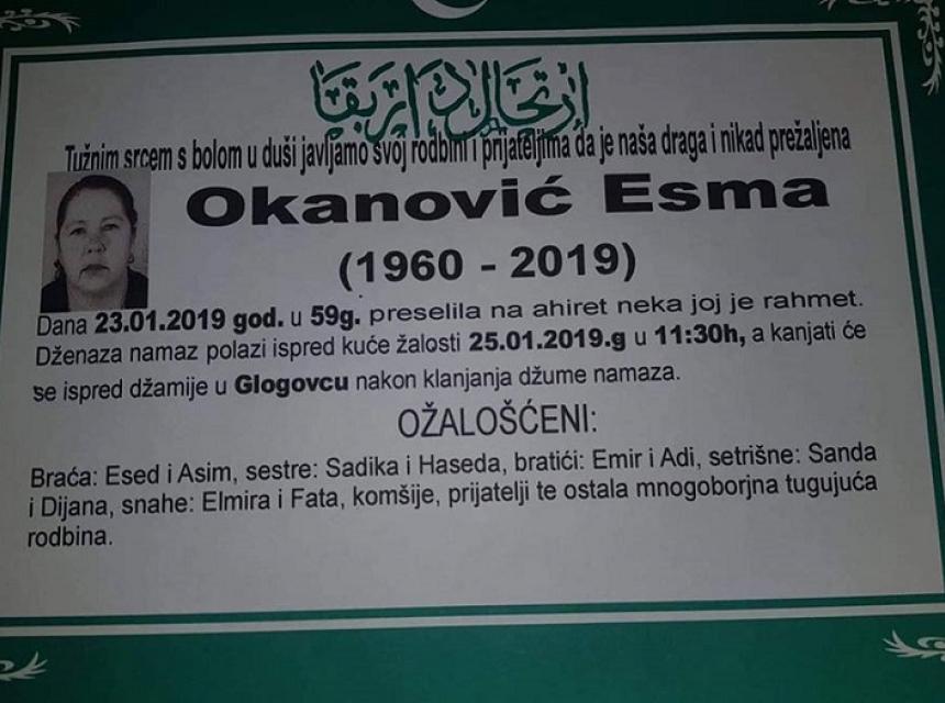 Tužnim srcem i bolom u duši javljamo rodbini i prijateljima da je naša draga Okanović Esma dana 23.01.2019. god. u 59. godini života preselila na Ahiret.