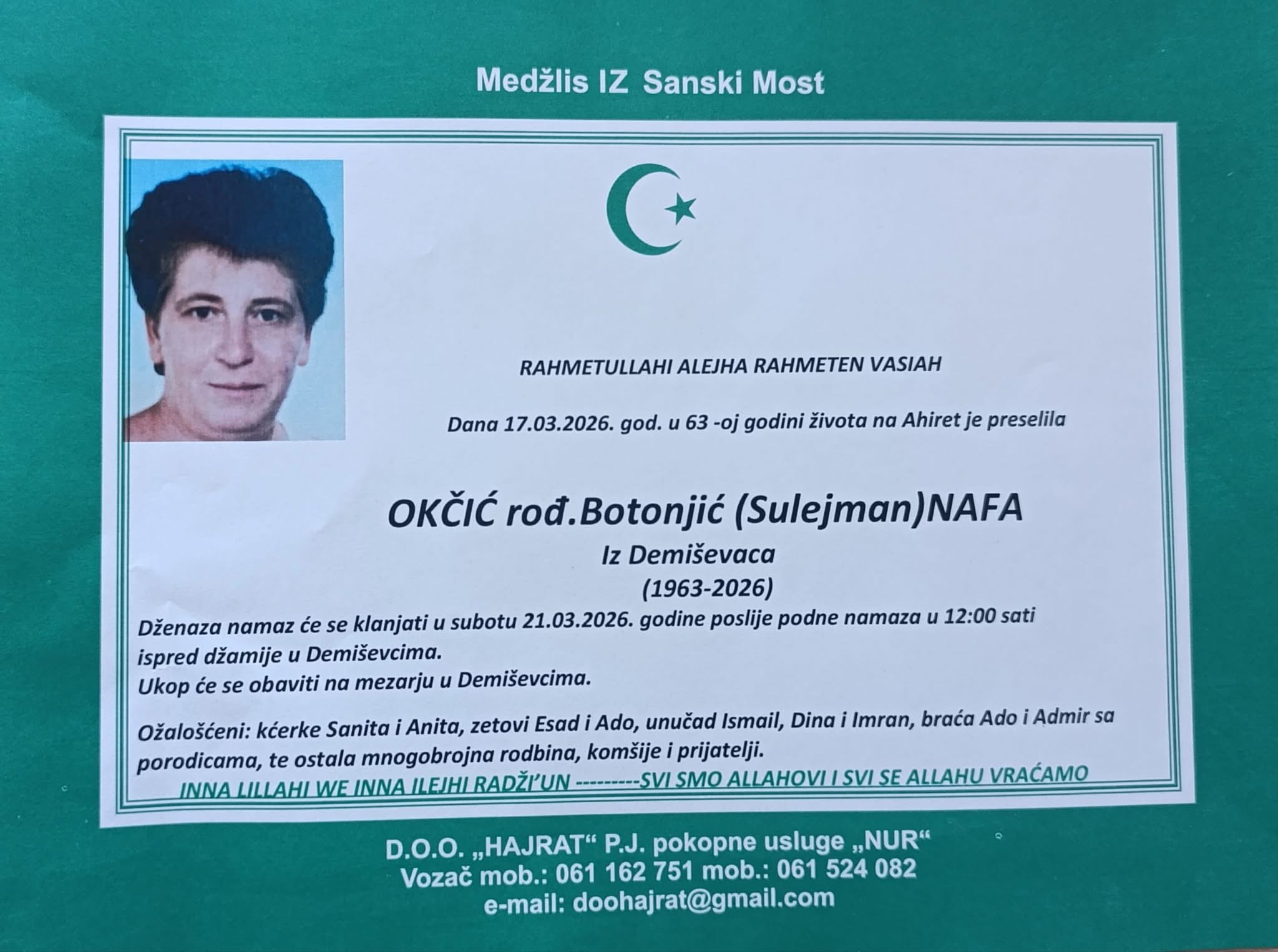Dženaza-namaz će se klanjati u subotu, 21.03.2026. godine poslije podne-namaza u 12:00 sati ispred džamije u Demiševcima.