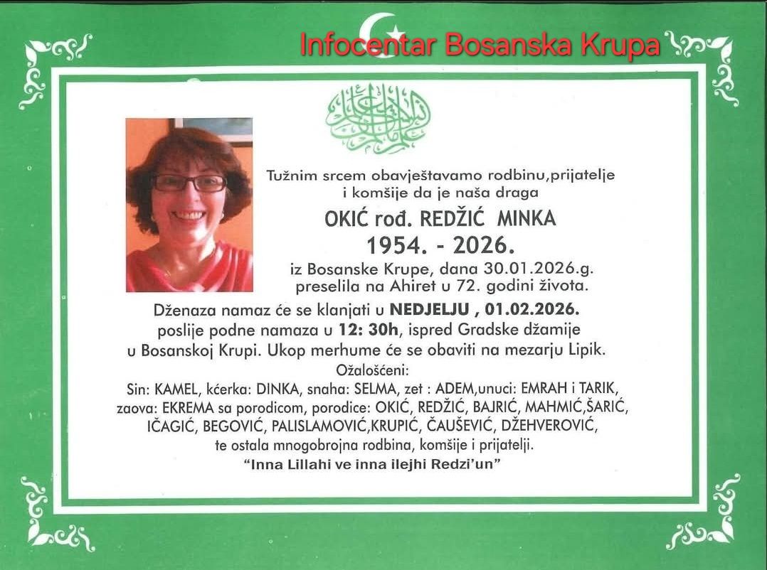 Tužnim srcem obavještavamo rodbinu, prijatelje i komšije da je naša draga OKIĆ rod. REDŽIĆ MINKA iz Bosanske Krupe, dana 30.01.2026.g. preselila na Ahiret u 72. godini života.