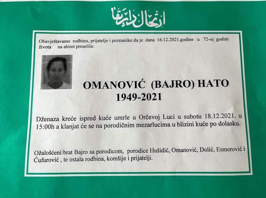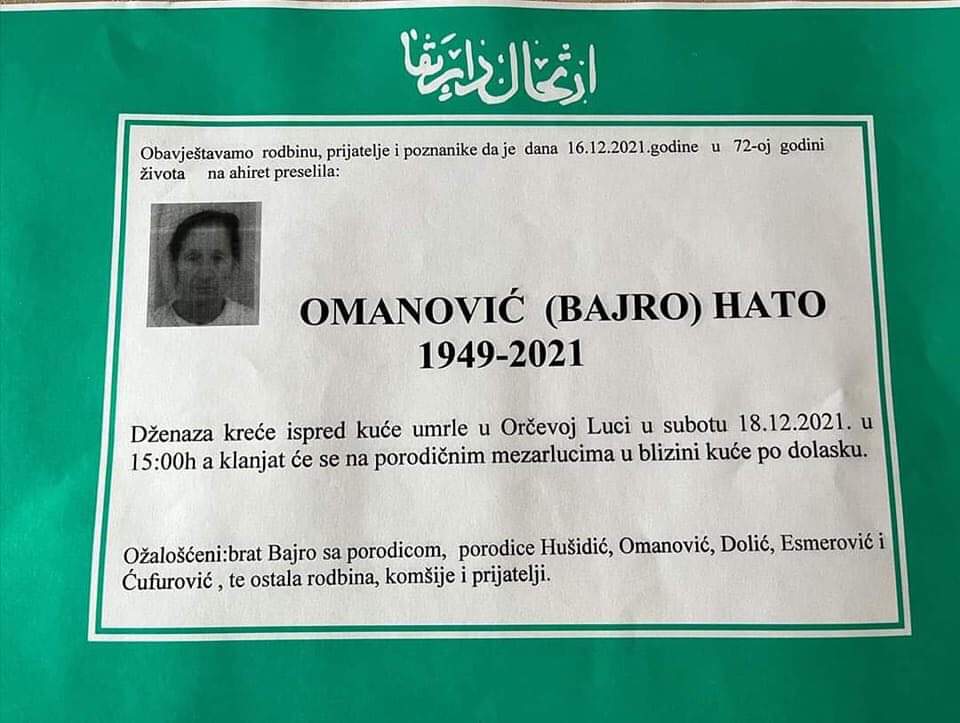 Tužnog srca i s bolom u duši obavještavamo rodbinu, komšije i prijatelje da je naša draga Omanović (Bajro) Hato dana 16.12.2021. u 72. godini života preselila na ahiret.