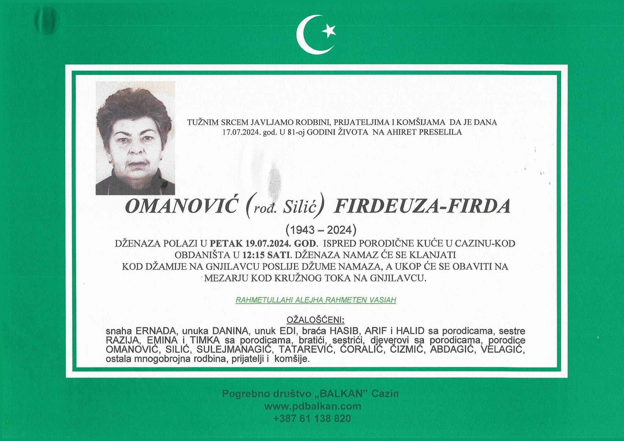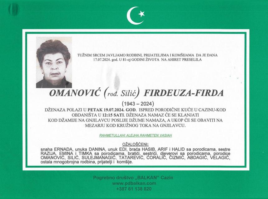 Tužnim srcem i bolom u duši javljamo rodbini, prijateljima i komšijama da je naša draga Omanović (rođ. Silić) Firdeuza-Firda, dana 17.07.2024. godine u 81-oj godini života, preselila na Ahiret.