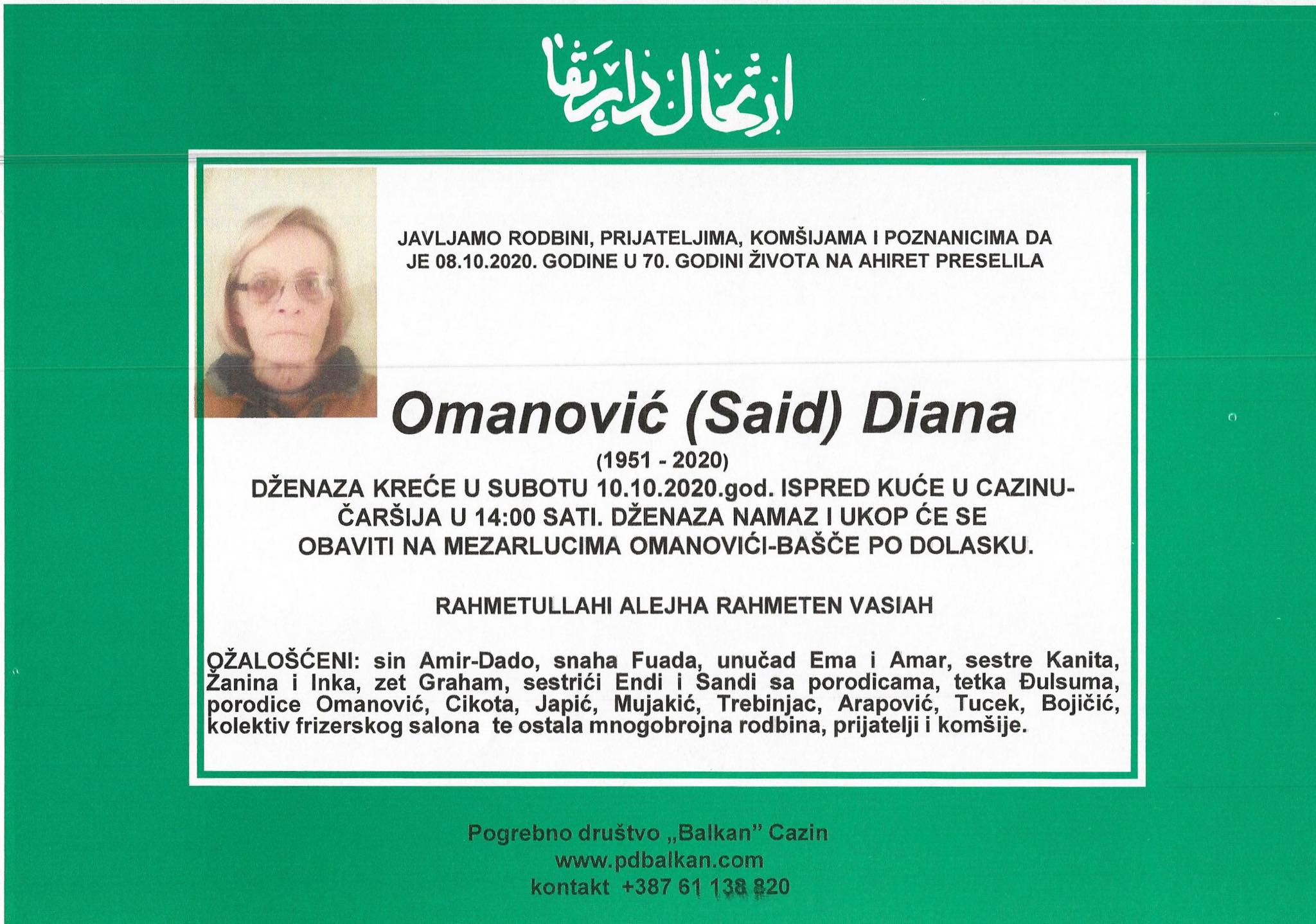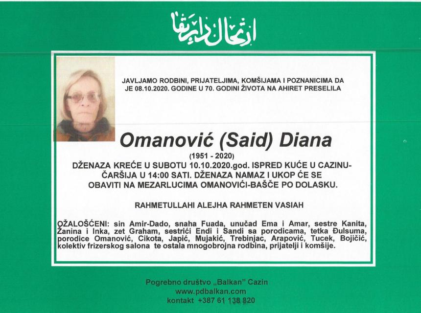 Tužnog srca i s bolom u duši obavještavamo rodbinu, komšije i prijatelje da je naša draga Omanović (Said) Diana, dana 08.10.2020. godine, u 70-oj. godini života, preselila na Ahiret.