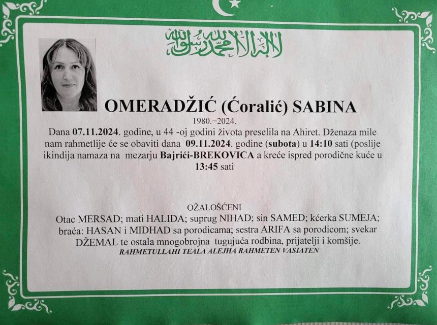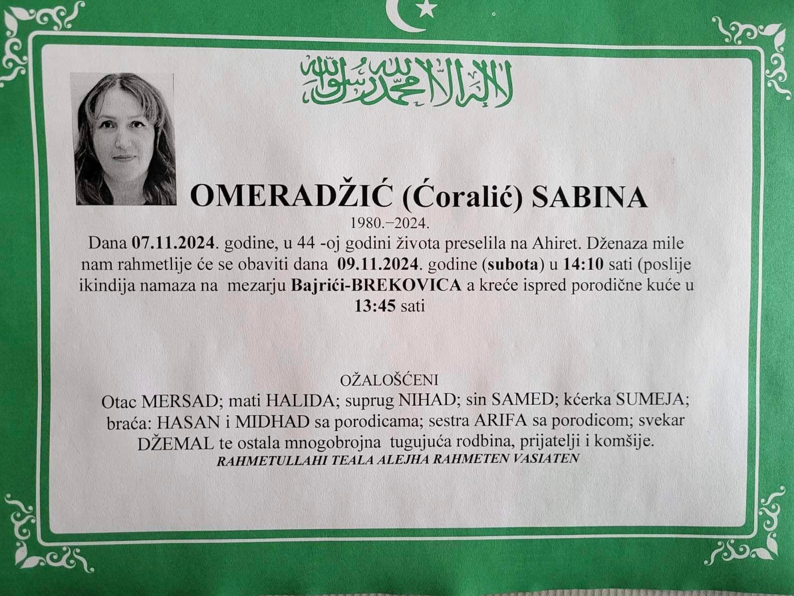 Tužnim srcem i bolom u duši obavještavamo rodbinu, prijatelje i komšije da je naša draga Omeradžić (Ćoralić) Sabina, dana 07.11.2024. godine, u 44-oj godini života, preselila na Ahiret.