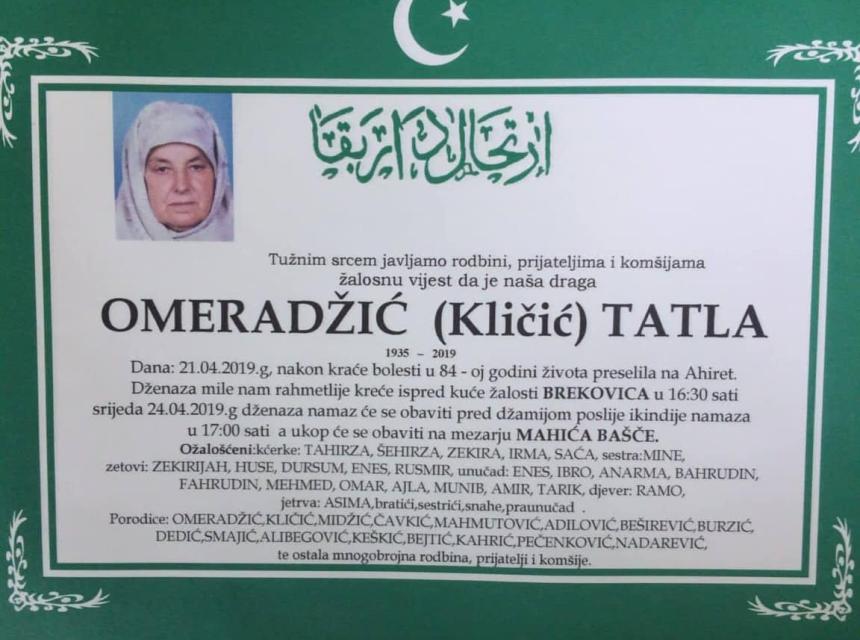 Tužnim srcem i bolom u duši javljamo rodbini, prijateljima i komšijama žalosnu vijest da je u 84-oj godini na Ahiret preselila Omeradžić (rođ. Kličić) Tatla.