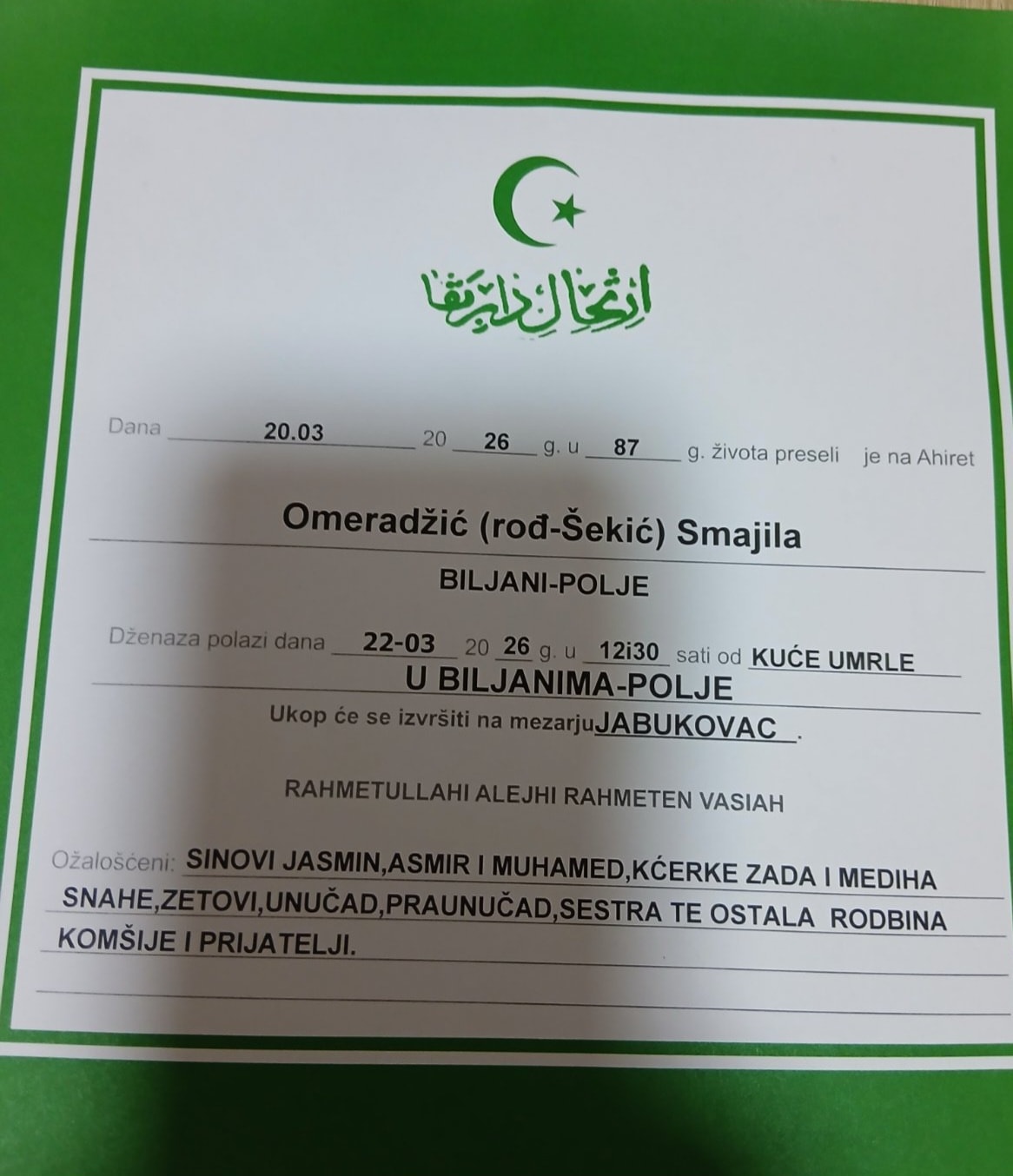 Dženaza polazi dana BILJANI-POLJE 22.03 2026 g. u 12 i 30 sati od KUĆE UMRLE U BILJANIMA-POLJE.