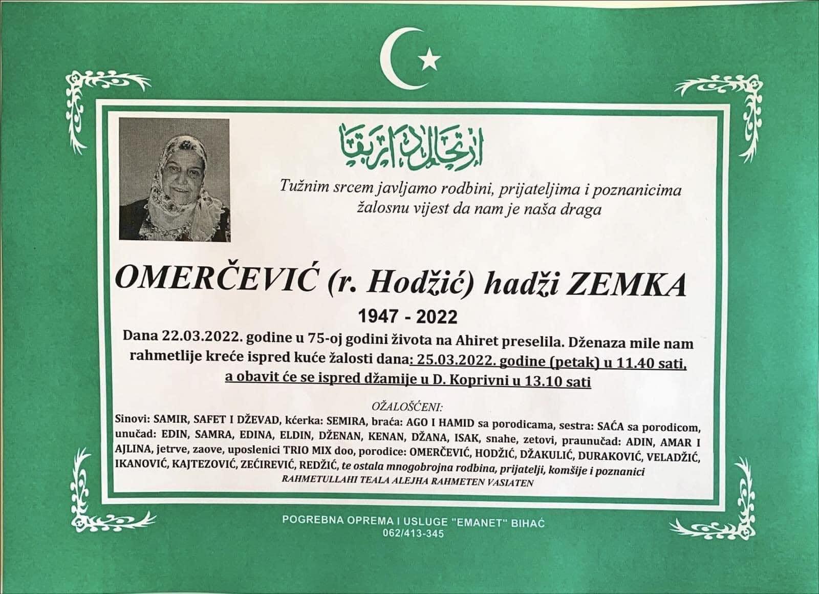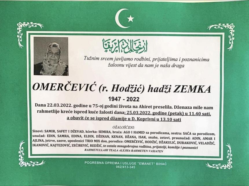 Tužnog srca i s bolom u duši obavještavamo rodbinu, komšije i prijatelje da je naša draga Omerčević (rođ. Hodžić) hadži Zemka, dana 22.03.2022. godine, u 75-oj godini života, preselila na Ahiret.
