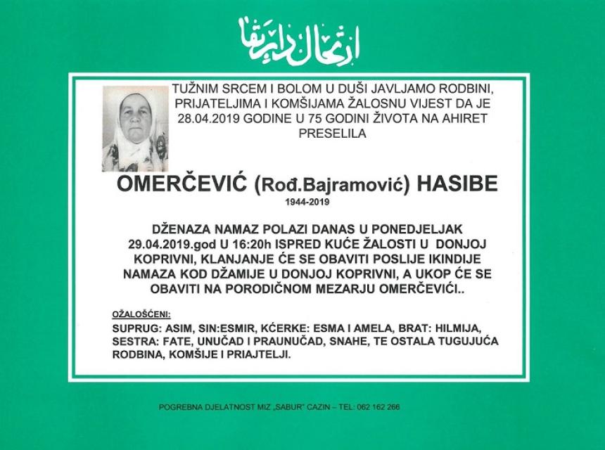 Dženaza namaz polazi u ponedjeljak 29.04.2019.godine u 16:20 sati ispred kuće žalosti u Donjoj Koprivni.Klanjanje će se obaviti poslije ikindije namaza kod džamije u Donjoj Koprivni, a ukop će se obaviti na prodičnom mezarju Omerčevići.