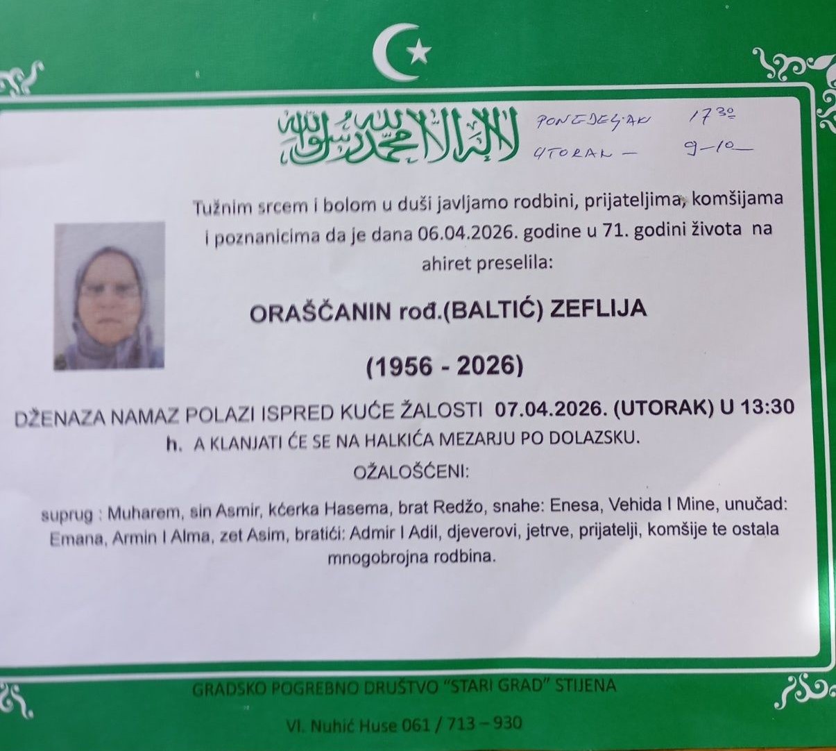 DŽENAZA NAMAZ POLAZI ISPRED KUĆE ŽALOSTI 07.04.2026. (UTORAK) U 13:30 h. A KLANJATI ĆE SE NA HALKIĆA MEZARJU PO DOLASKU.