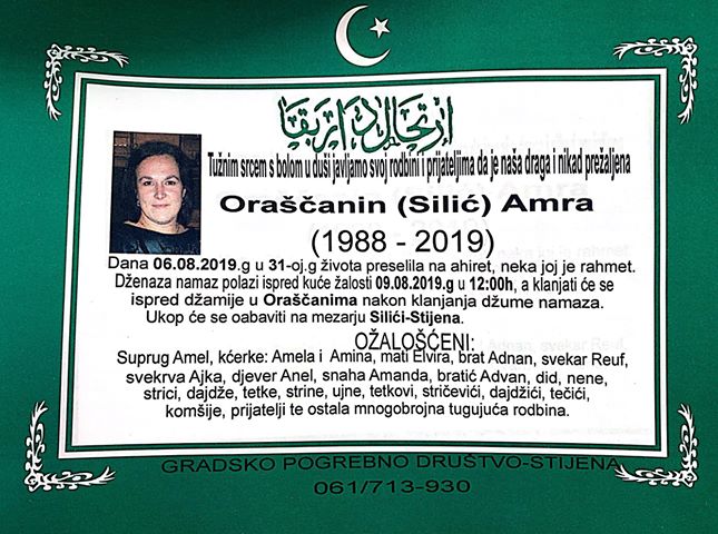 Tužnim srcem s bolom u duši javljamo svoj rodbini i prijateljima da je naša draga i nikad prežaljena Orašćanin (Silić) Amra dana 06.08.2019. fodine u 31-oj godini života preselila na Ahiret.
