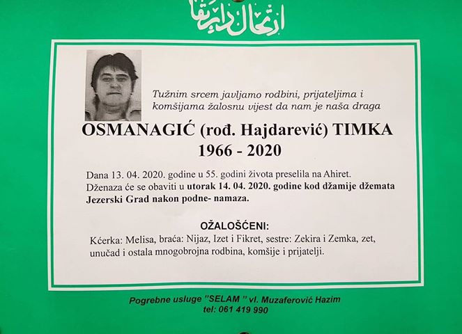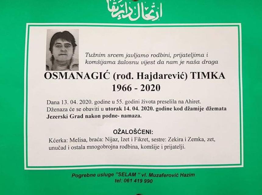 Tužnim srcem i bolom u duši javljamo rodbini i prijateljima da je naša draga i nikad prežaljena Osmanagić (Hajdarević) Timka dana 13.04.2020. godine u 55-toj godini života preselila na Ahiret.