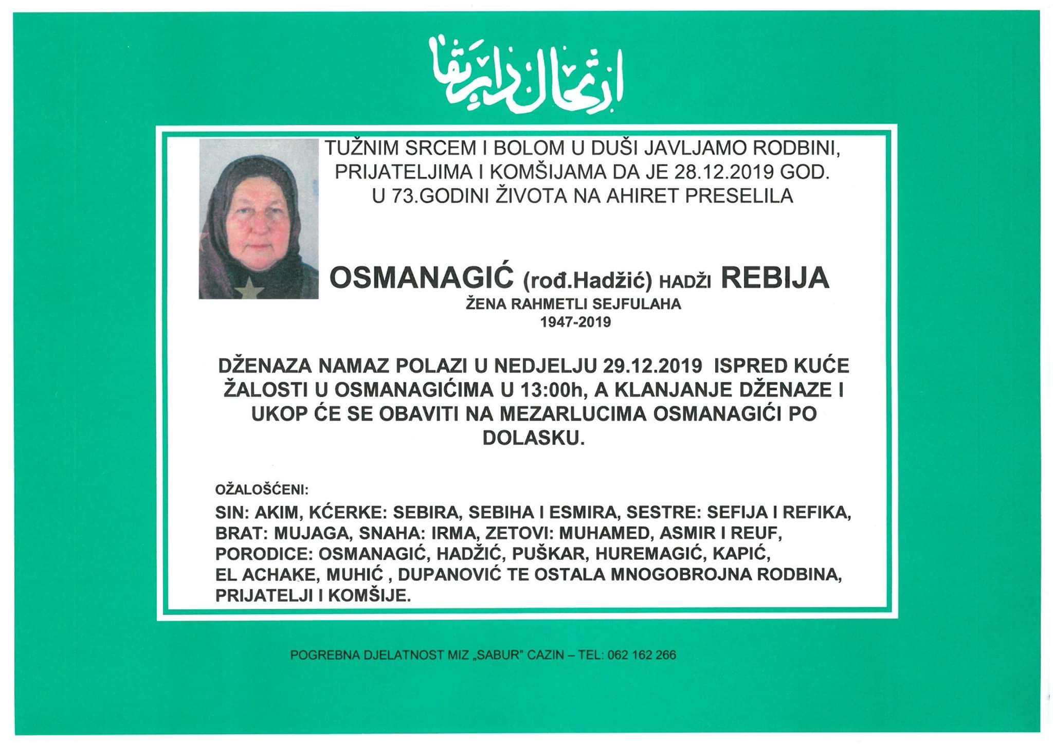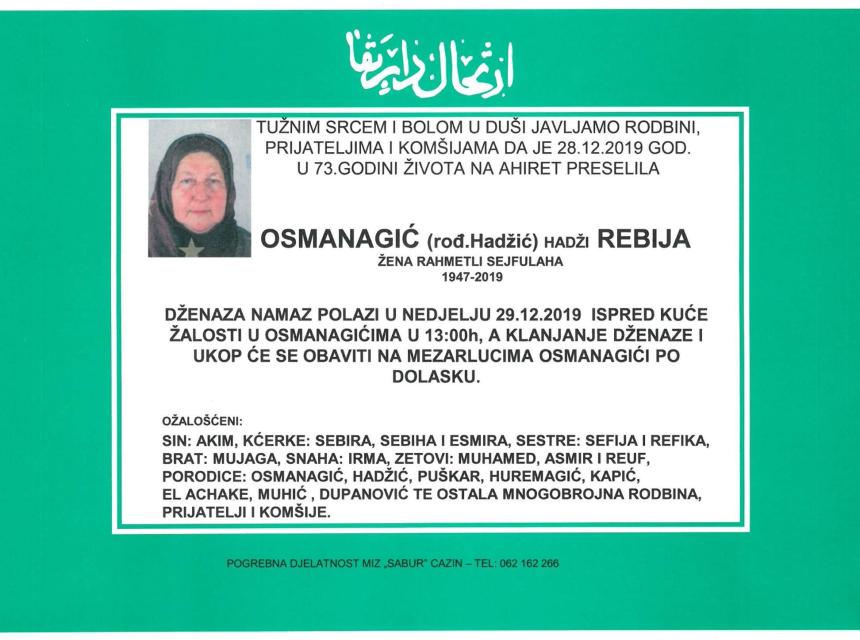 Tužnim srcem i bolom u duši javljamo rodbini i prijateljima da je dana 28.12.2019. godine u 73-oj godini života, na Ahiret preselila Džaferović (rođ. Hadžić) hadži Rebija.