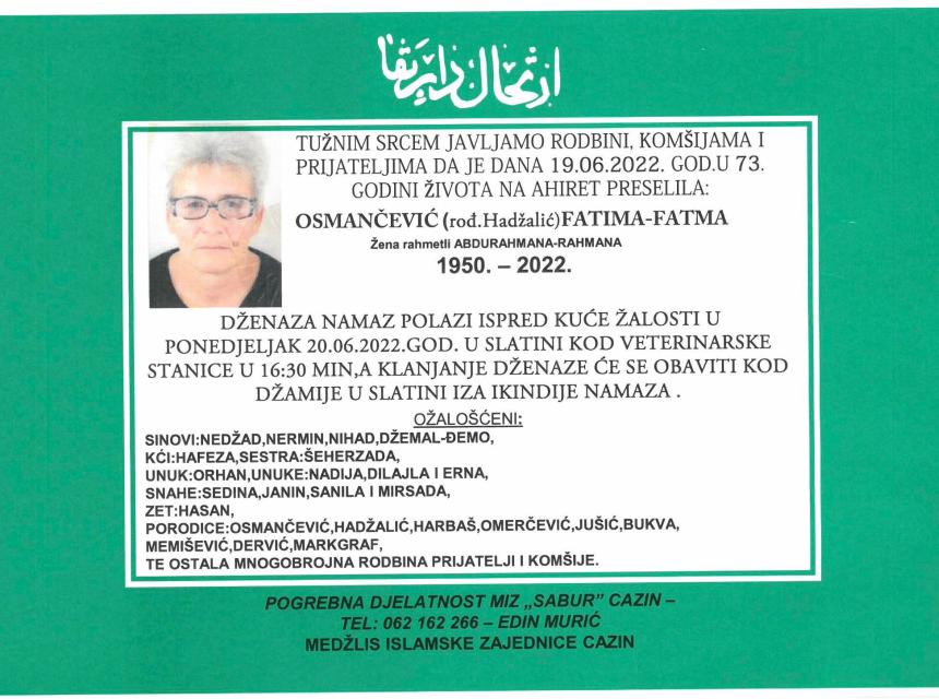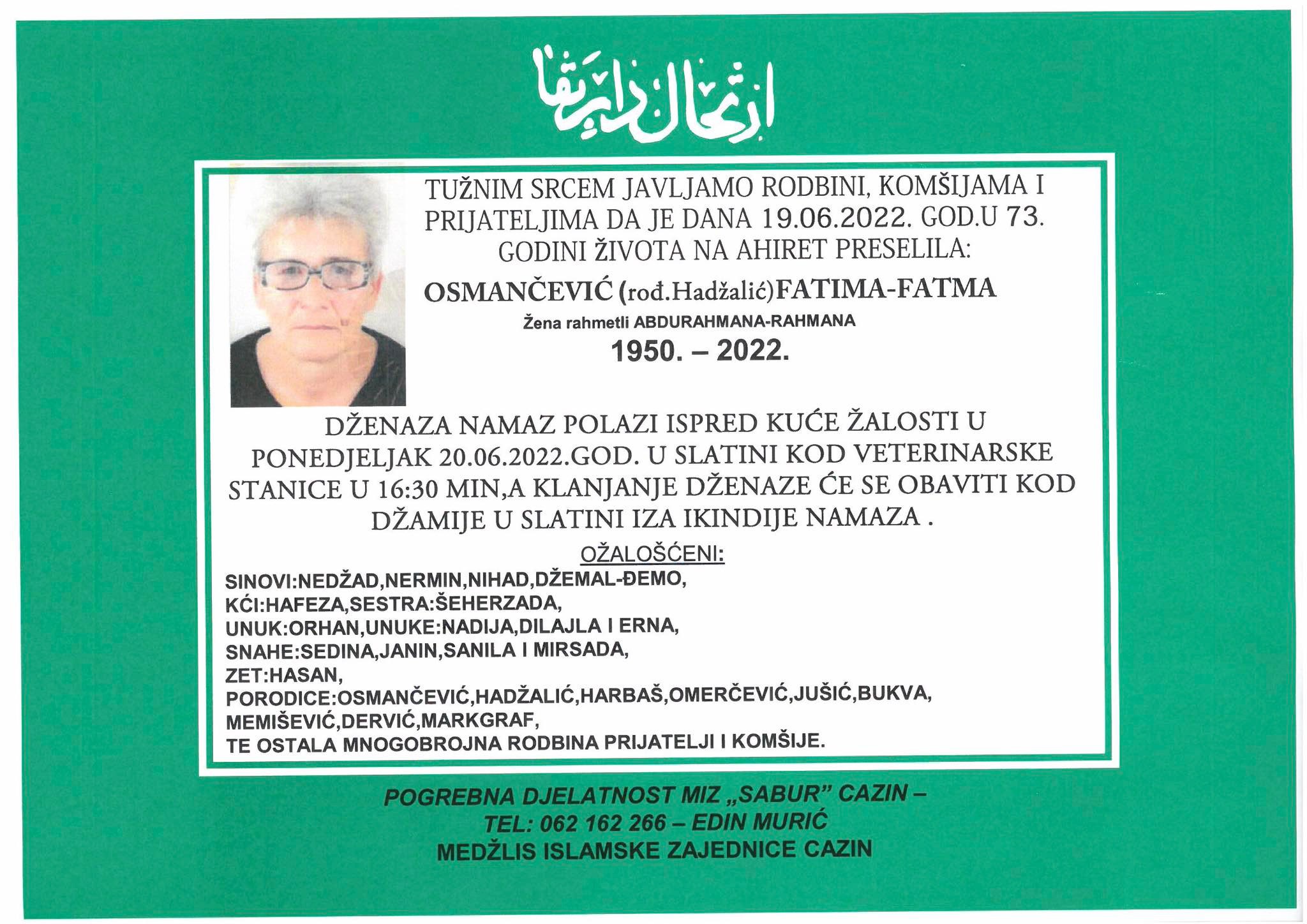 Tužnog srca i s bolom u duši obavještavamo rodbinu, komšije i prijatelje da je naša draga Osmančević (rođ. Hadžalić) Fatima - Fatma preselila na Ahiret.