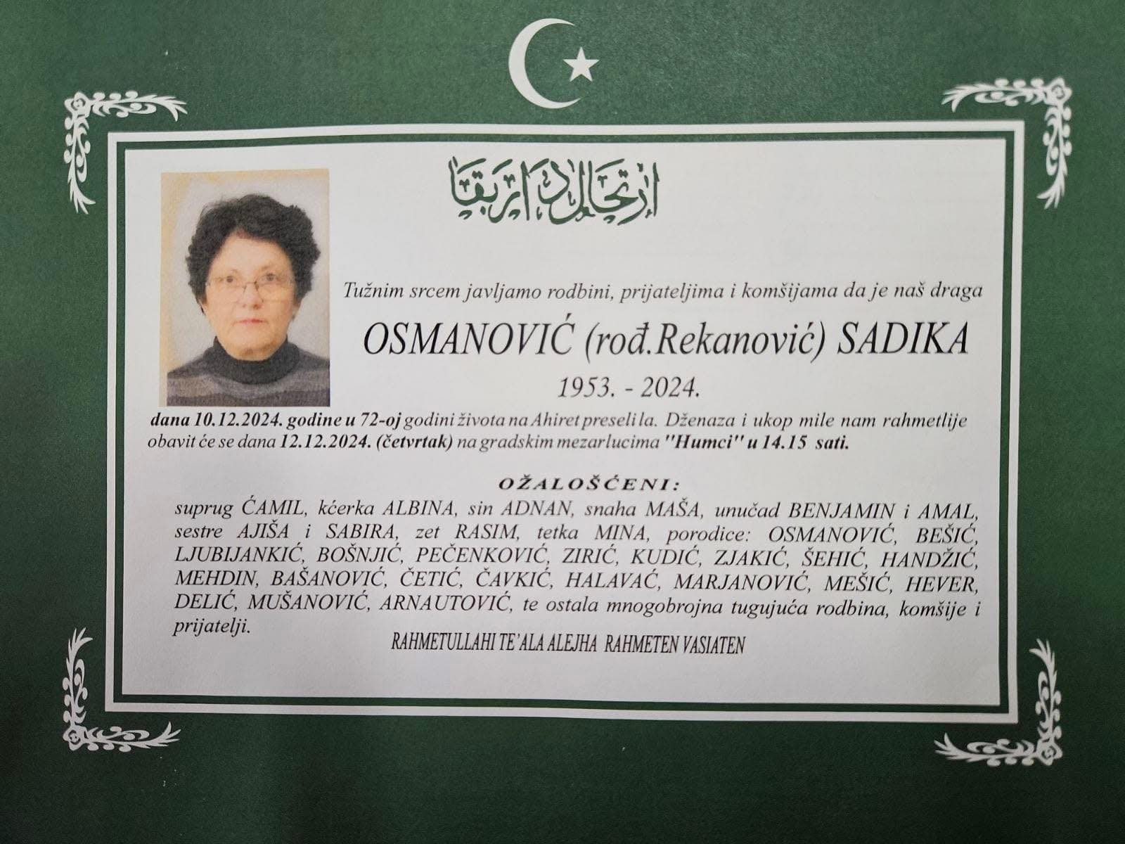 Duboko ožalošćeni obavještavamo rodbinu, prijatelje i komšije da je dana 10.12.2024. god. u 72-oj godini života na ahiret preselila Osmanović (rođ. Rekanović) Sadika.