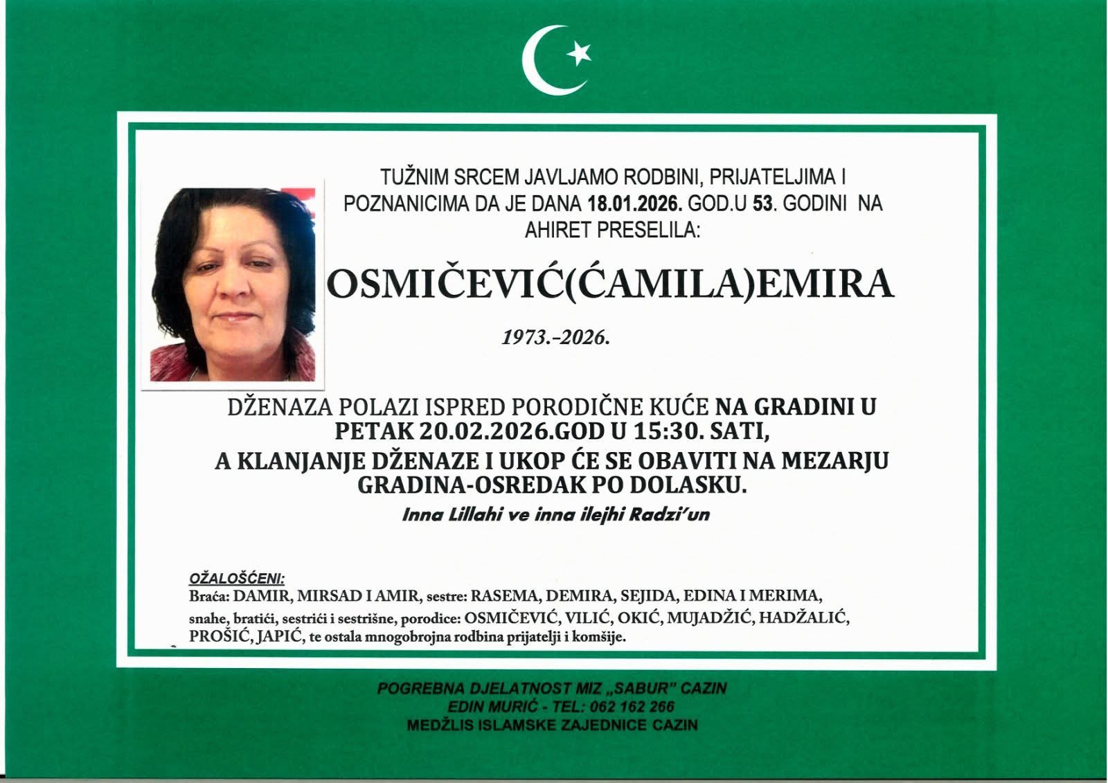 Dženaza polazi ispred porodične kuće na Gradini u petak, 20. 02. 2026. godine u 15:30 sati, a klanjanje dženaze i ukop će se obaviti na mezarju Gradina–Osredak po dolasku.