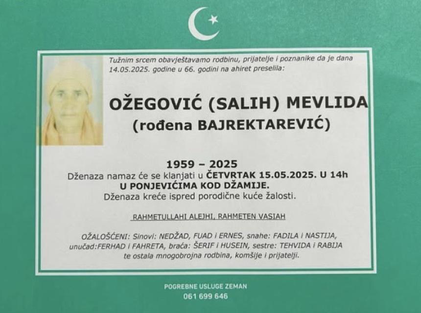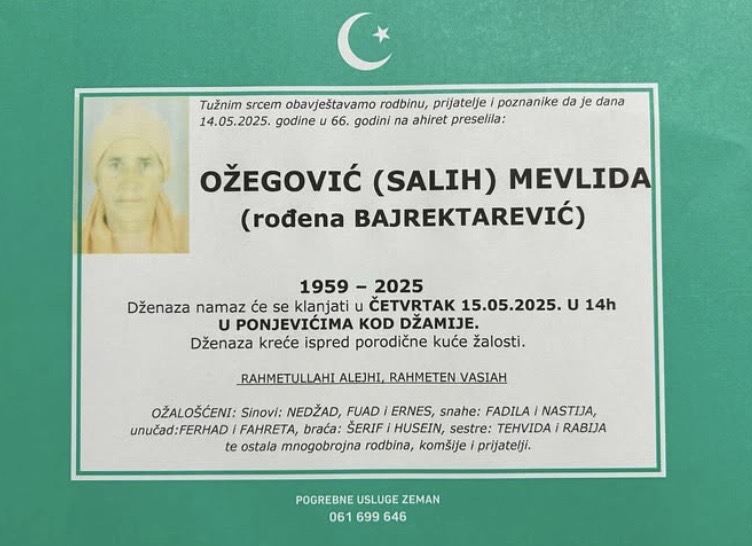 Tužna srca obavještavamo rodbinu, prijatelje i komšije da je dana 14.05.2025. god. u 66. godini života, na ahiret preselila naša draga OŽEGOVIĆ (Salih) MEVLIDA rođ. Bajrektarević.