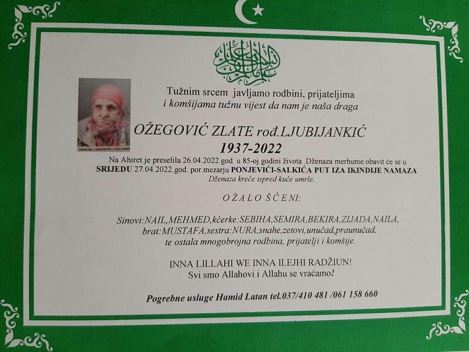 Tužnog srca i s bolom u duši obavještavamo rodbinu, komšije i prijatelje da je naša draga Ožegović Zlate (rođ. Ljubijankić) u 85. godini života preselila na Ahiret.