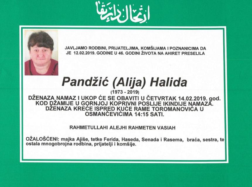 Javljamo rodbini, prijateljima, komšijama i poznanicima da je dana 12.02.2019. godine u 46. godini života na Ahiret preselila Pandžić (Alija) Halida.