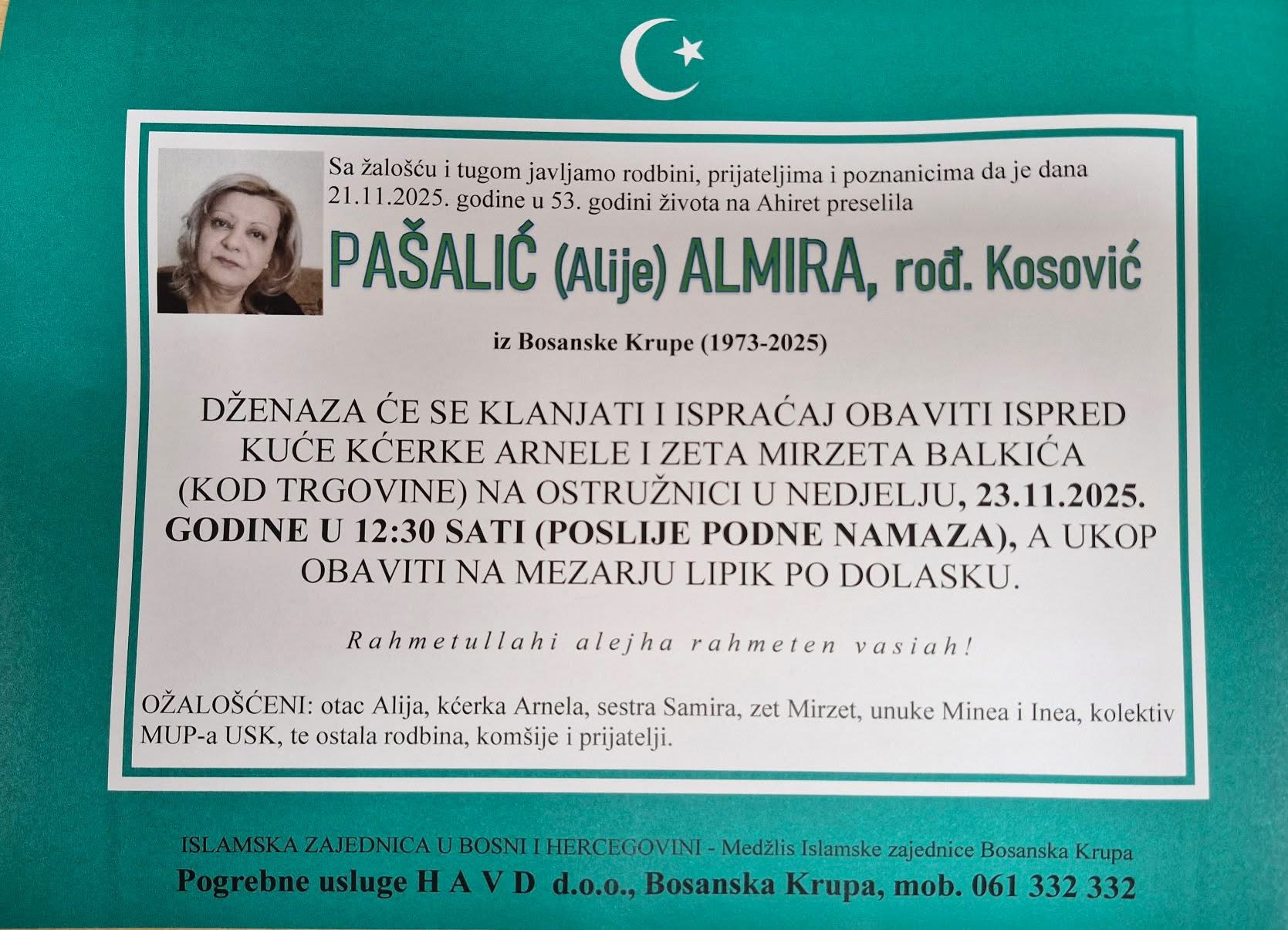 Sa žaljenjem i tugom javljamo rodbini, prijateljima i poznanicima da je dana 21.11.2025. godine, u 53. godini života, na Ahiret preselila