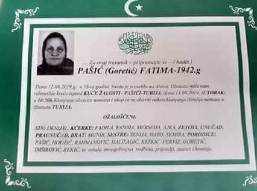 Pašić (Goretić) Fatima dana 12.08.2019.g. u 78-oj godini života je preselila Na Ahiret. Dženaza mole nam rahmetlije kreće ispred kuće žalosti- Pašići- Turija dana 13.08.2019.(utorak) u 16:30h.