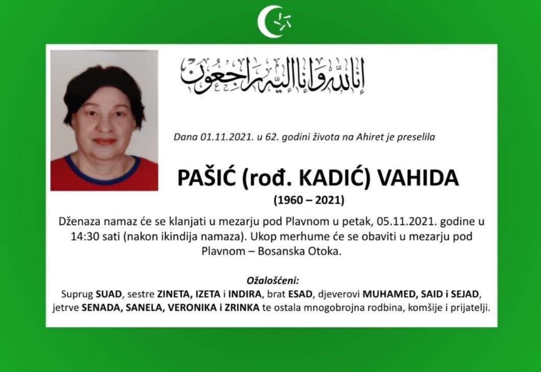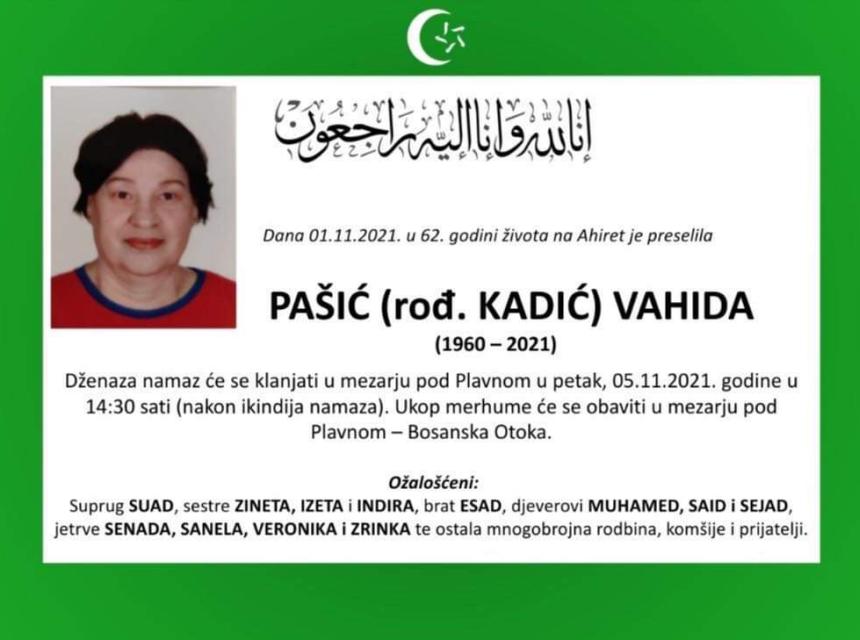 Tužnog srca i s bolom u duši obavještavamo rodbinu, komšije i prijatelje da je naša draga Pašić (rođ. Kadić) Vahida dana 01.11.2021. u 62. godini života preselila na ahiret.