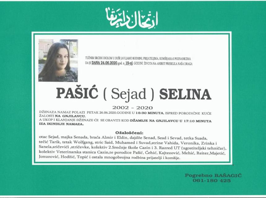 Tužnog srca i s bolom u duši obavještavamo rodbinu, komšije i prijatelje da je naša draga Pašić (Sejad) Selina ,dana 24.06.2020. godine, u 19. godini života preselila na Ahiret.