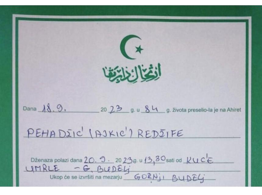 Tužnim srcem i bolom u duši javljamo rodbini, prijateljima i komšijama da je naša draga Pehadžić (Ajkić) Redžife, dana 18.09.2023. godine u 84-oj godini života, preselila na Ahiret.