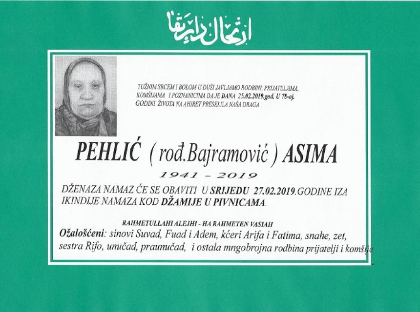 Tužnim srcem javljamo rodbini, prijateljima, komšijama i poznanicima da je dana 25.02.2019. godine u 78-oj godini života na Ahiret preselila naša draga Pehlić (rođ.Bajramović) Asima.