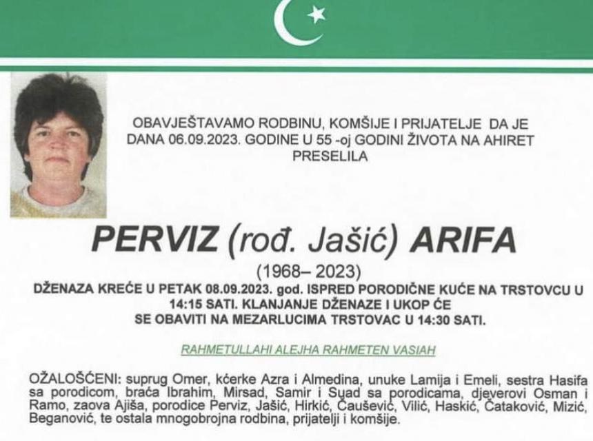 Obavještavamo rodbinu, komšije i prijatelje da je naša draga Perviz (rođ. Jašić) Arifa, dana 06.09.2023. godine u 55-oj godini života, preselila na Ahiret.