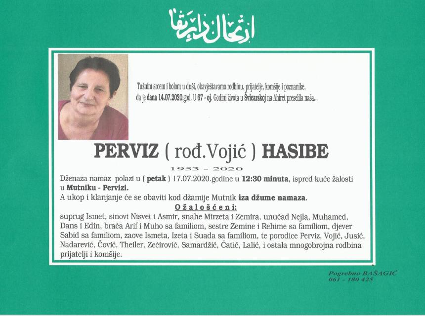 Tužnog srca i s bolom u duši obavještavamo rodbinu, komšije i prijatelje da je naša draga Perviz (rođ. Vojić) Hasibe, dana 14. jula 2020. godine, u 67-oj godini života, preselila na Ahiret.