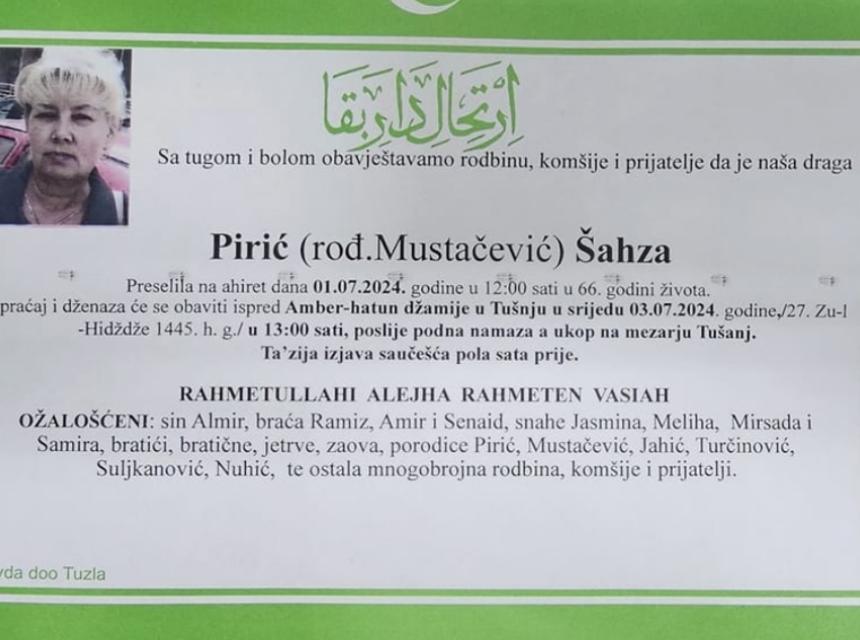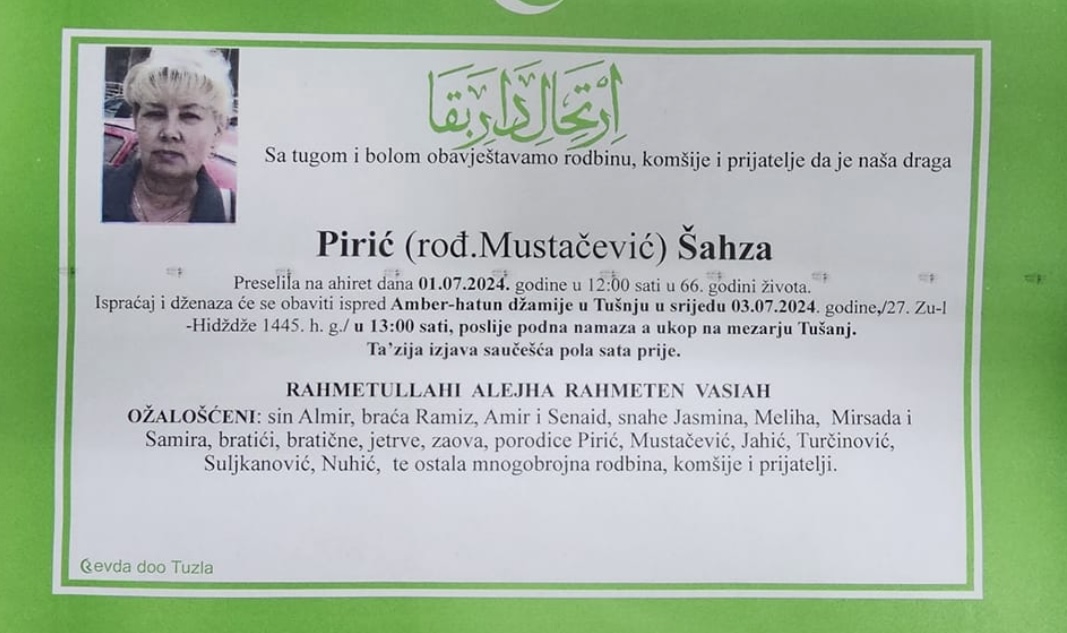 Tužnim srcem i bolom u duši javljamo rodbini, prijateljima i komšijama da je naša draga Pirić (rođ. Mustačević) Šahza, dana 01.07.2024. godine u 66-oj godini života, preselila na Ahiret.