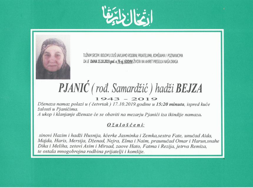 Tužnim srcem javljamo rodbini, prijateljima, komšijama i poznanicima da je dana 15.10.2019. godine u 76-oj godini života na Ahiret preselila naša draga Pjanić (rođ. Samardžić) hadži Bejza.